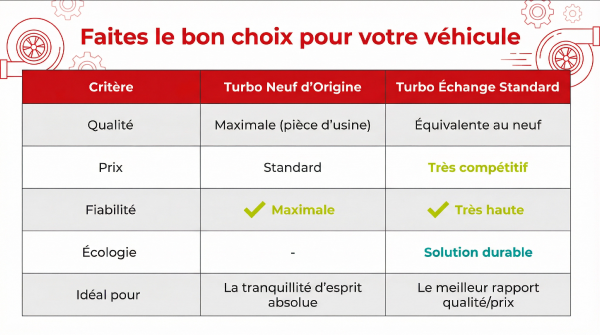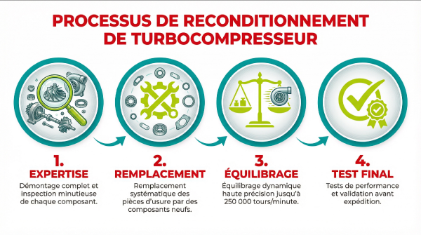 2. Turbos en Échange StandardProcessus : C'est une solution économique et écologique qui suit un processus industriel rigoureux. Chaque turbo est entièrement démonté, ses pièces d'usure sont systématiquement remplacées par des composants neufs, puis il est équilibré et testé pour garantir des performances équivalentes au neuf. Avantage : Vous bénéficiez d'une qualité irréprochable à un coût très compétitif. |